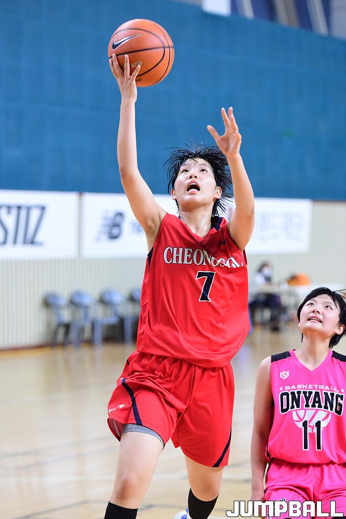 21일 경상북도 김천실내보조체육관에서 열린 2021 연맹회장기 전국남녀중고농구 김천대회 여중부 청솔중과 온양여중의 경기, 청솔중 최사랑이 레이업슛을 시도하고 있다.