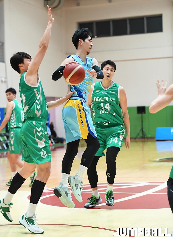 [점프볼=이천/문복주 기자] 17일 이천 LG챔피언스파크에서 열린 D리그 1차 원주 DB와 서울 삼성의 경기, 삼성 강바일이 골밑에서 어시스트를 시도하고 있다.