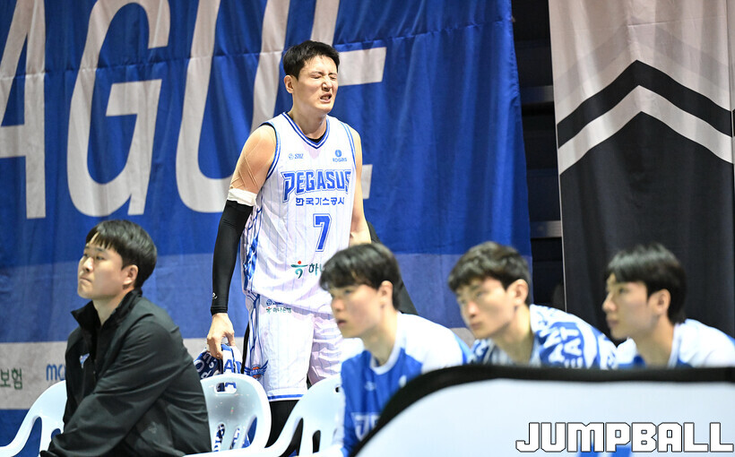 [점프볼=용인/문복주 기자] 3일 경희대 국제캠퍼스 선승관에서 열린 2025-2026 KBL D리그 안양 정관장과 대구 한국가스공사의 경기에서 한국가스공사 최진수가 공격중 충돌로 괴로운 표정을 짓고 있다.