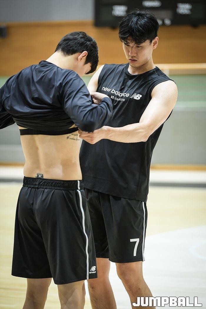 [JB포토] 후배의 심박계 착용을 돕고 있는 kt 김민욱