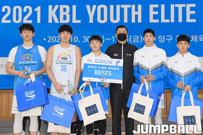 5일 강원도 양구에 위치한 양구 청춘체육관에서 포카리 스웨트 히어로즈 2021 KBL 유스 엘리트 캠프 고등부 퇴소식을 가졌다. 경복고 홍상민, 동아고 이동근, 무룡고 문유현, 용산고 김승우, 양정고 한재혁이 베스트 5상을 수상했다.