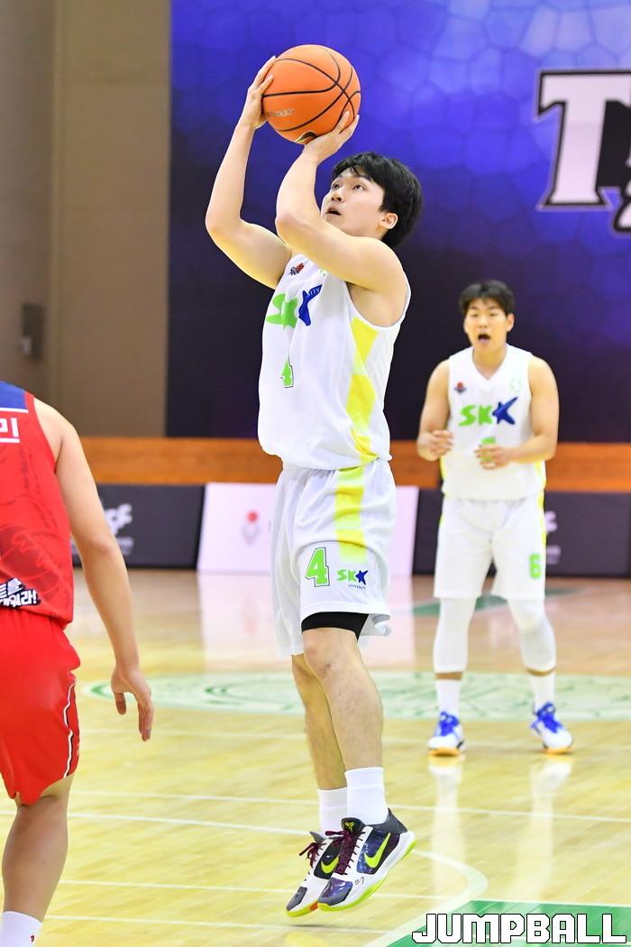 2일 충주 건국대학교 글로컬캠퍼스 건국체육관에서 열린 2021 KUSF 대학농구 U리그 플레이오프 단국대와 성균관대의 경기. 성균관대 송동훈이 페이더웨이 슛을 던지고 있다.