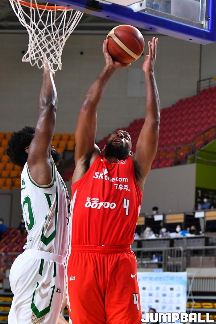 18일 경상북도 상주시 상주실내체육관에서 열린 2021 MG새마을금고 KBL컵 대회 서울 SK와 원주 DB의 결승 경기, SK 리온 윌리엄스가 골밑슛을 던져 득점하고 있다.
