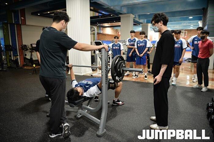 20일 KBL센터 지하 2층에 위치한 트레이닝 센터에서 진행된 2022 KBL 신인선수 드래프트 컴바인, 참가 선수들이 벤치 프레스를 진행하고 있다. [점프볼=신사/유용우 기자]