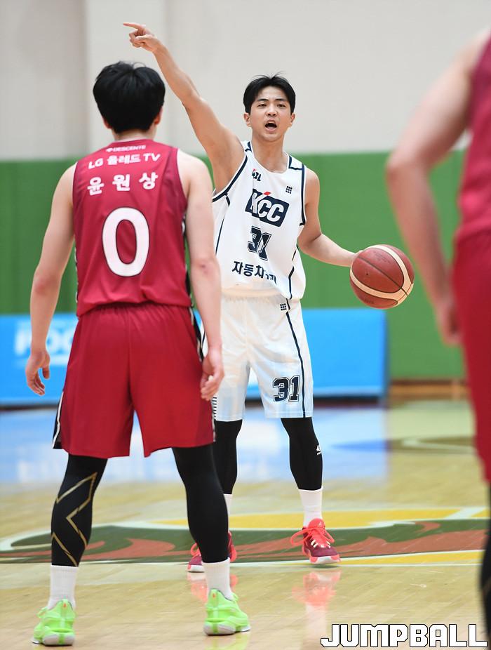 [점프볼=이천/문복주 기자] 26일 이천 LG챔피언스파크에서 열린 2020-2021 KBL D리그 2차대회 창원 LG와 전주 KCC의 경기, KCC 이진욱이 공격 위치를 지시하고 있다.