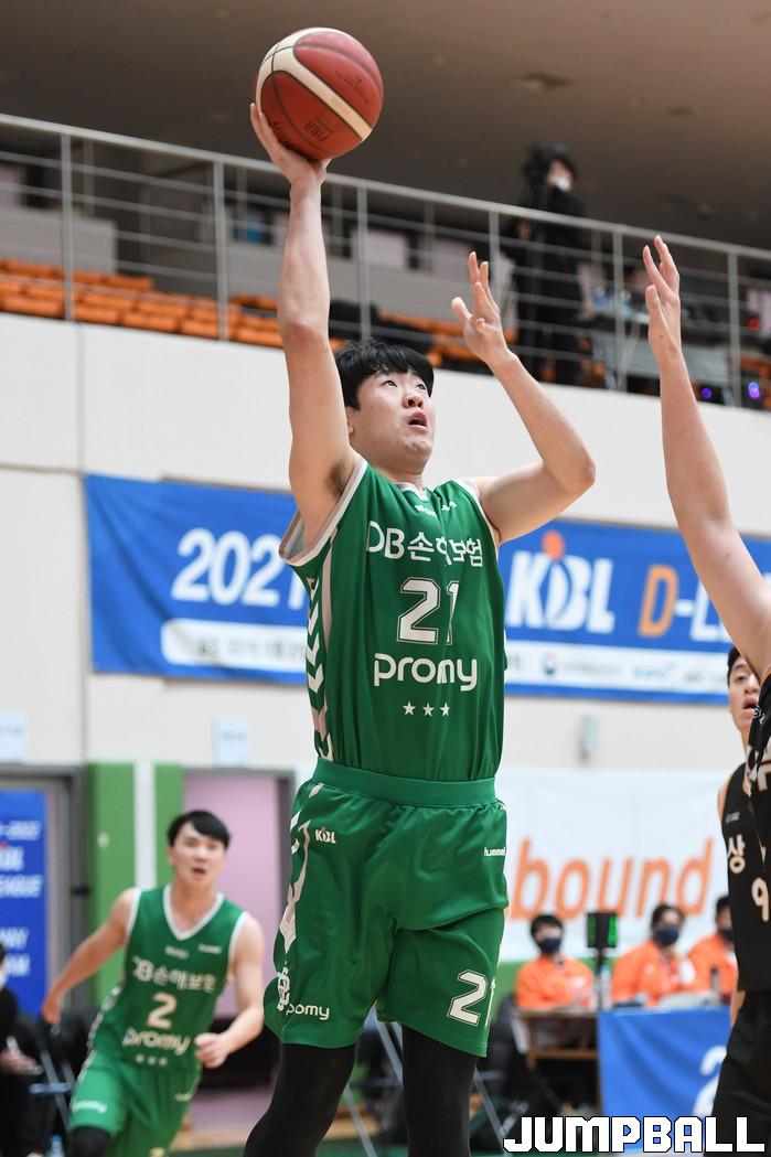 17일 이천에 위치한 LG 챔피언스파크에서 열린 2021-2022 KBL D리그 상무와 원주 DB의 경기, DB 김철욱이 훅슛을 시도하고 있다.