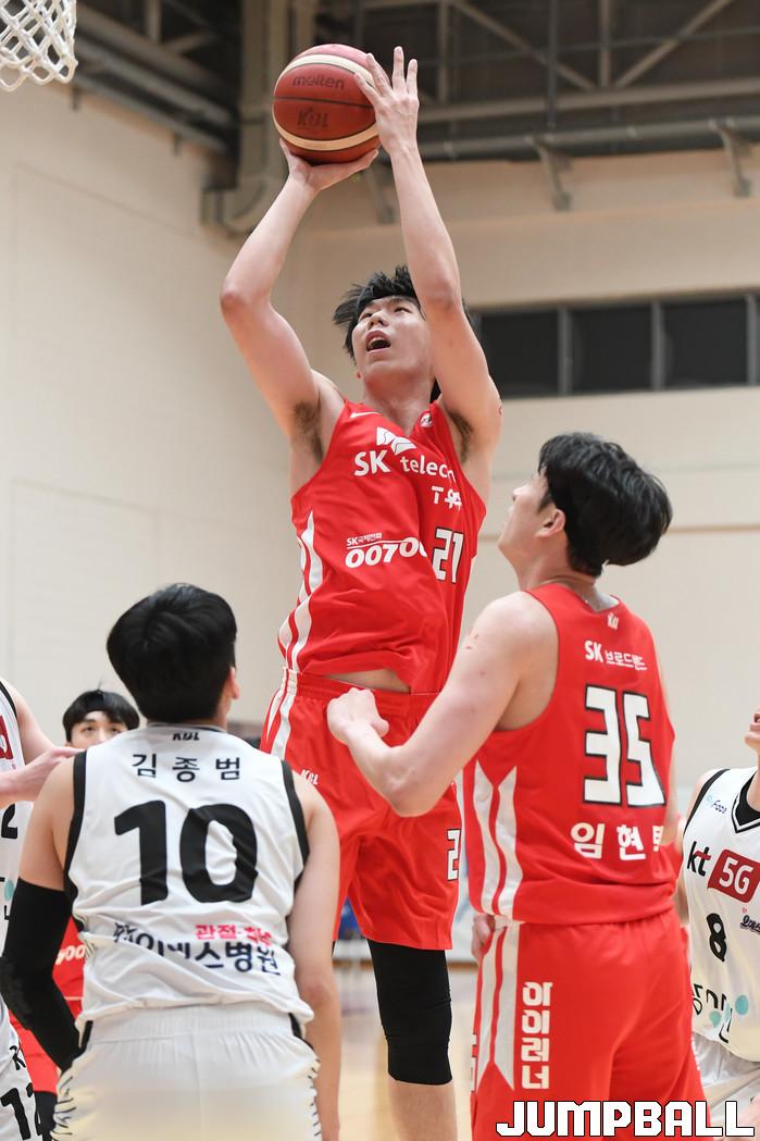 26일 경기도 이천에 위치한 LG 챔피언스파크에서 열린 2021-2022 KBL D리그 서울 SK와 수원 KT의 경기, SK 선상혁이 골밑에서 슛을 시도하고 있다.
