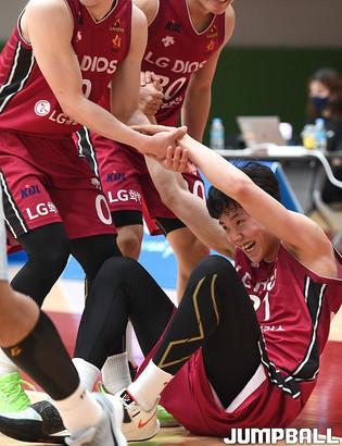 [점프볼=이천/문복주 기자] 26일 이천 LG챔피언스파크에서 열린 2020-2021 KBL D리그 2차대회 창원 LG와 전주 KCC의 경기, LG 정해원이 밖으로 나가는 볼을 잡아서 패스를 하고 있다.