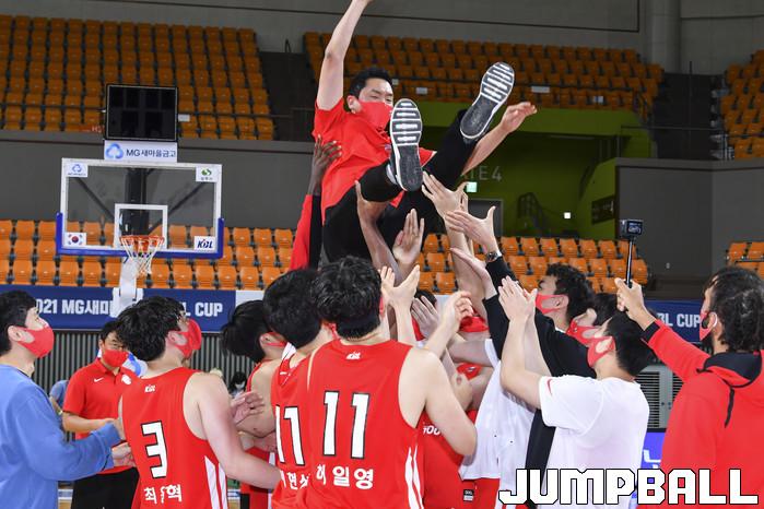 18일 경상북도 상주시 상주실내체육관에서 열린 2021 MG새마을금고 KBL컵 대회 서울 SK와 원주 DB의 결승 경기, SK 선수들이 전희철 감독을 헹가래 하고 있다.