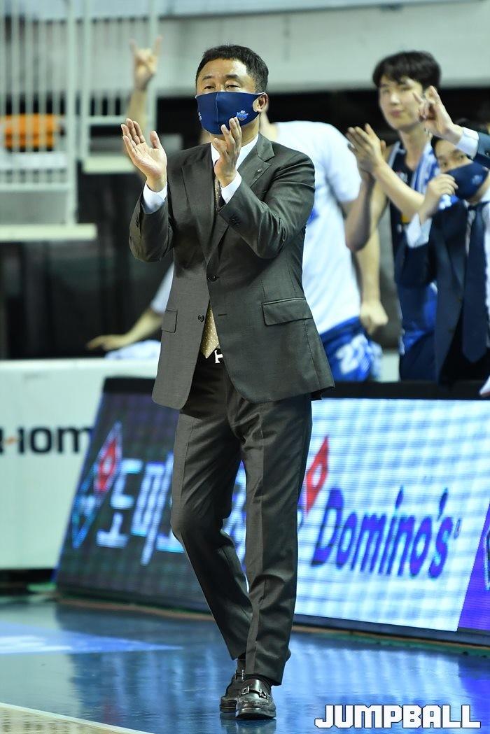 [점프볼=전주/유용우 기자] 5일 전주실내체육관에서 열린 2020-2021 현대모비스 프로농구 전주 KCC와 안양 KGC인삼공사의 챔피언결정전 2차전, KCC 전창진 감독이 선수들에게 박수를 보내고 있다.