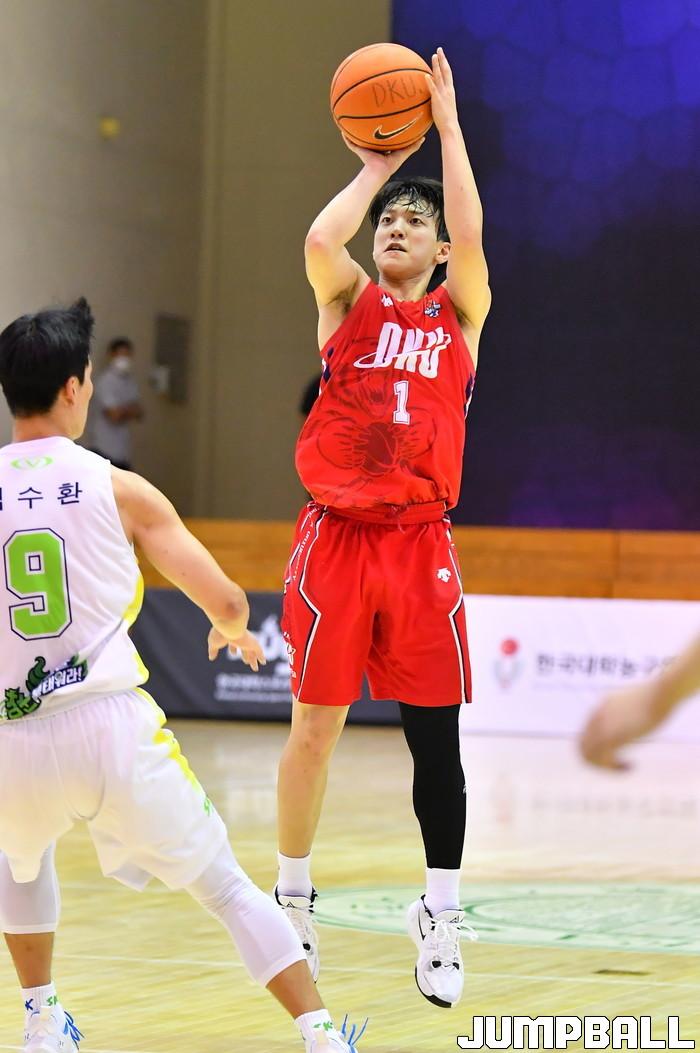 2일 충주 건국대학교 글로컬캠퍼스 건국체육관에서 열린 2021 KUSF 대학농구 U리그 플레이오프 단국대와 성균관대의 경기. 단국대 조종민이 3점슛을 던지고 있다.