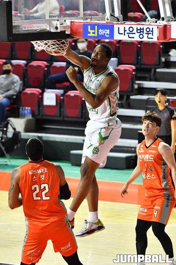 [점프볼=인천/유용우 기자] 07일 인천 삼산체육관에서 열린 2020-2021 현대모비스 프로농구 인천 전자랜드와 원주 DB의 경기, DB 얀테 메이튼이 덩크를 성공하고 있다.
