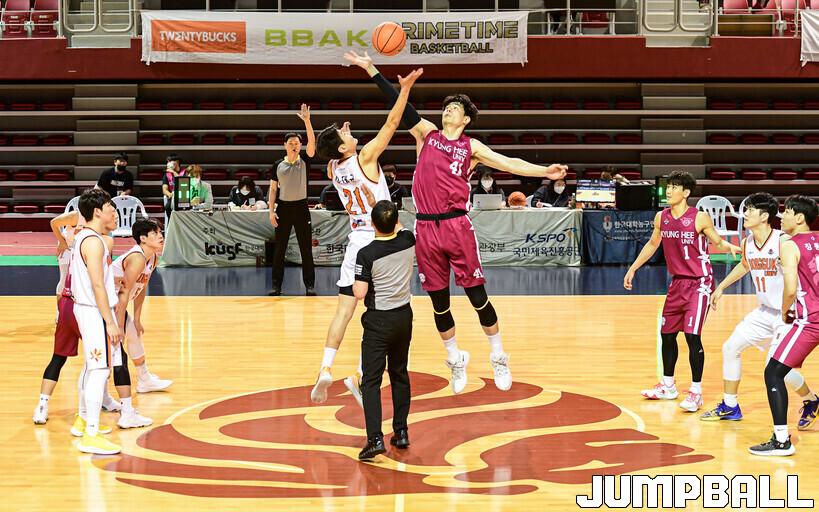 2일 경희대 국제캠퍼스 선승관에서 열린 2022 KUSF 대학농구 U-리그 경희대와 동국대의 플레이오프 8강전 경기, 점프볼로 경기가 시작되었다.