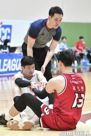 25일 이천 LG챔피언스파크 실내농구장에서 열린 2021-2022 KBL D리그 KCC와 DB의 경기. KCC 곽정훈이 리바운드를 적극적으로 얻어내고 있다.