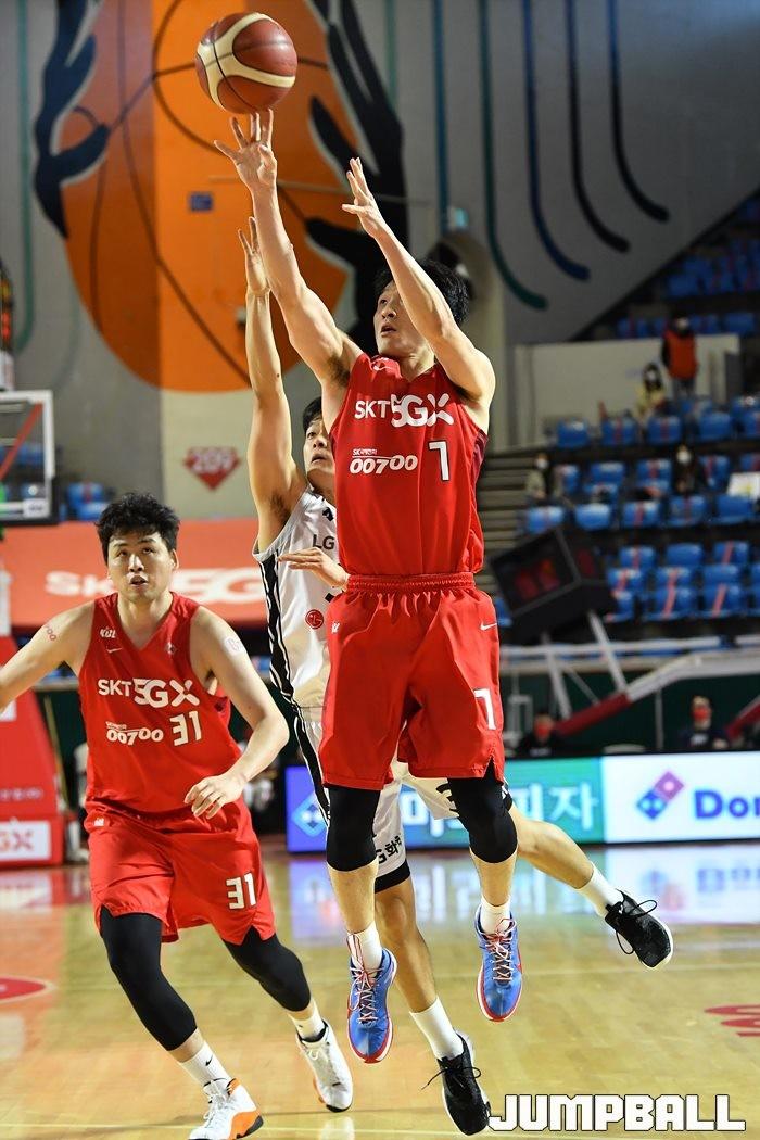 [점프볼=잠실/유용우 기자] 04일 잠실학생체육관에서 열린 2020-2021 현대모비스 프로농구 서울 SK와 창원 LG의 경기, SK 변기훈이 슛을 시도하고 있다.