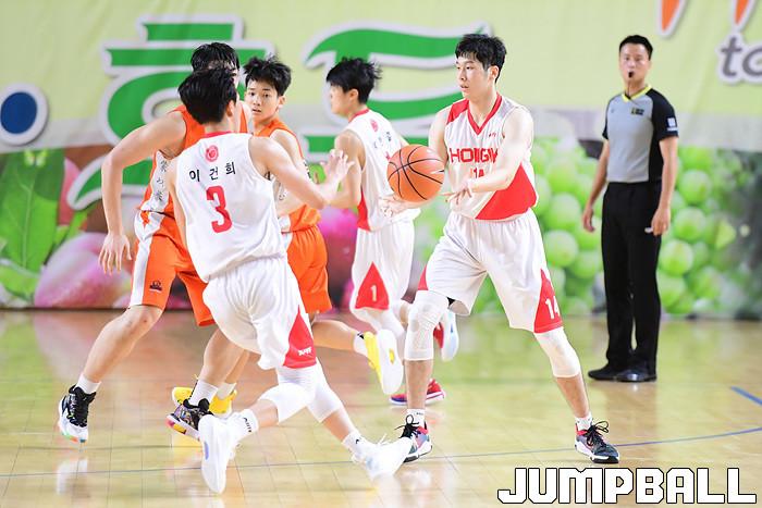 20일 김천실내체육관에서 열린 2021 연맹회장기 전국남녀중고농구 김천대회 남고부 홍대부고와 양정고의 경기, 홍대부고 지승현이 이건희에게 패스를 시도하고 있다.