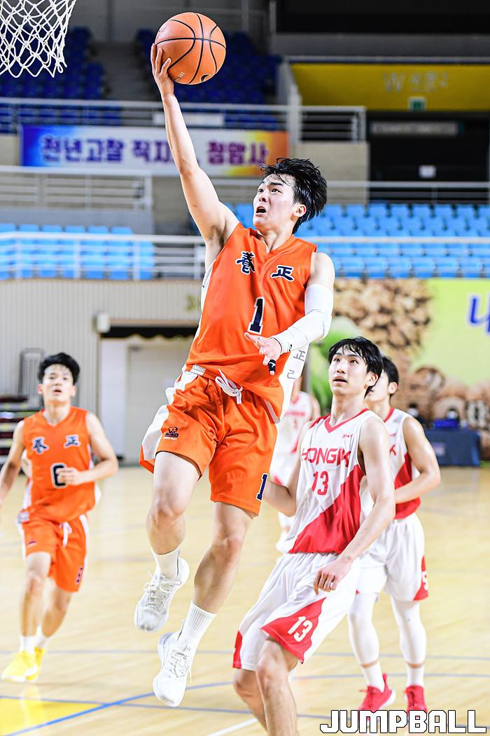20일 김천실내체육관에서 열린 2021 연맹회장기 전국남녀중고농구 김천대회 남고부 홍대부고와 양정고의 경기, 양정고 이민서가 레이업슛을 시도하고 있다.