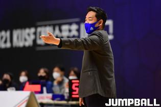 [점프볼=수원/박상혁 기자] 28일 서수원칠보체육관에서 열린 2021 KUSF 대학농구 U리그 경희대와 상명대의 경기, 경희대 김현국 감독이 선수들에게 지시를 내리고 있다.
