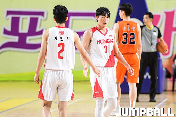 20일 김천실내체육관에서 열린 2021 연맹회장기 전국남녀중고농구 김천대회 남고부 홍대부고와 양정고의 경기, 홍대부고 이건희와 이진성이 하이파이브를 하고 있다.
