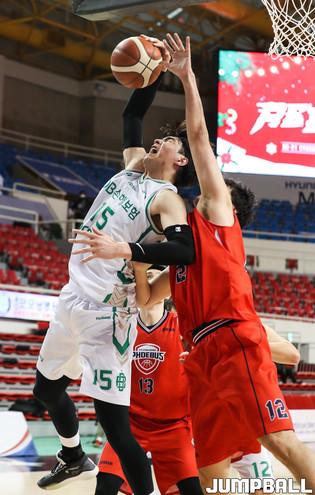 [점프볼=윤민호 기자] 26일 울산 동천체육관에서 열린 2020-2021 현대모비스 프로농구 울산 현대모비스와 원주 DB의 경기에서 DB 녹스가 현대모비스 장재석의 수비를 피해 슛을 하고 있다.