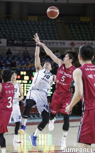 [점프볼=윤민호 기자] 26일 울산 동천체육관에서 열린 2020-2021 현대모비스 프로농구 울산 현대모비스와 원주 DB의 경기에서 DB 서현석이 현대모비스 장재석의 수비를 피해 슛을 하고 있다.