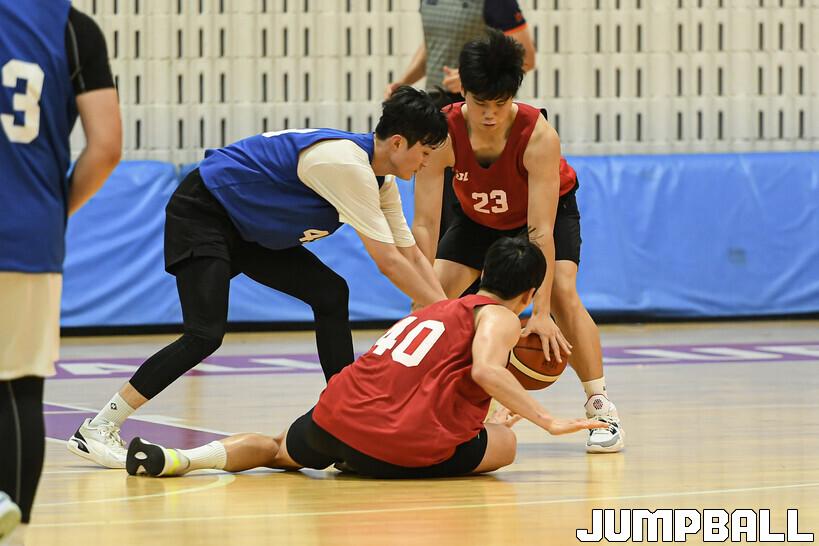 13일 고양보조체육관에서 2022 KBL 신인선수 드래프트 일반인 실기테스트, 레드팀과 블루팀 선수들이 루즈볼 다툼을 벌이고 있다.