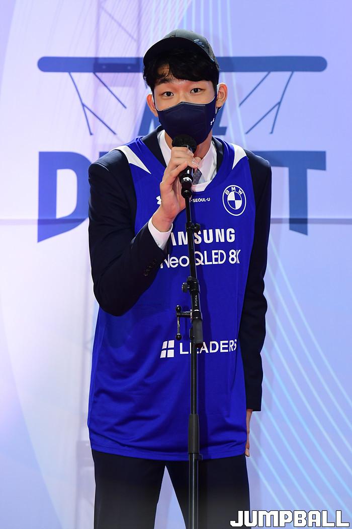 28일 잠실학생체육관에서 2021 KBL 신인선수 드래프트가 열렸다. 1라운드 1순위로 삼성에 지명된 이원석이 소감을 얘기하고 있다.