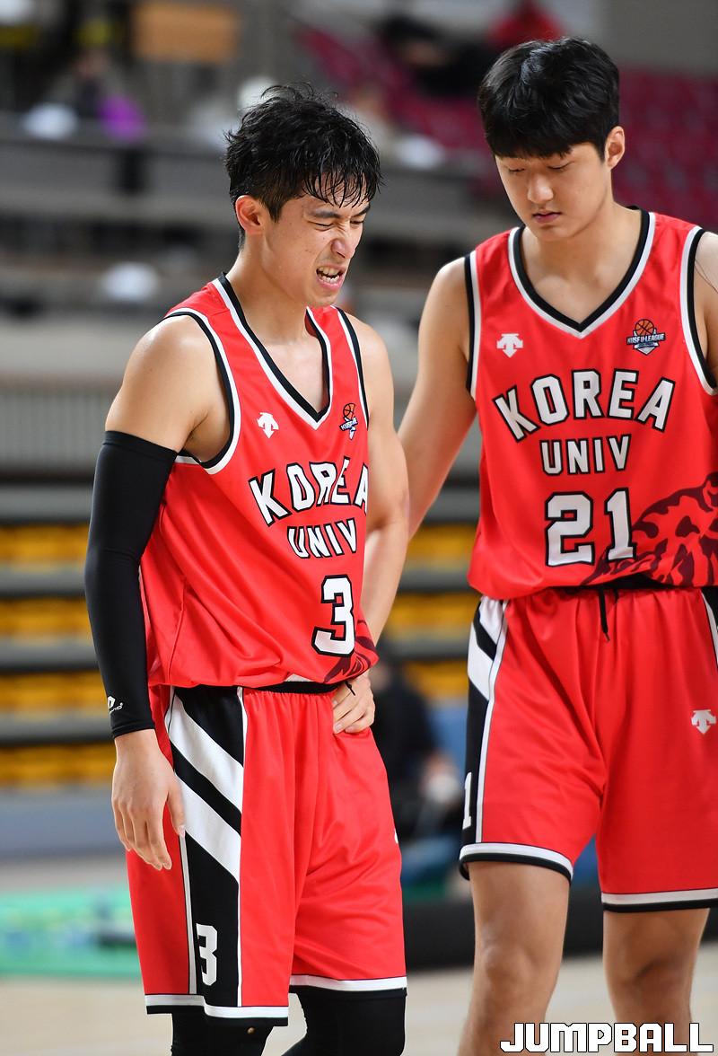 20일 경상북도 상주실내체육관에서 열린 제38회 MBC배 전국대학농구 상주대회에 고려대와 단국대의 준결승전으로 고려대 박무빈이 상대와의 충격으로 힘겨운 표정을 짓고 있다.