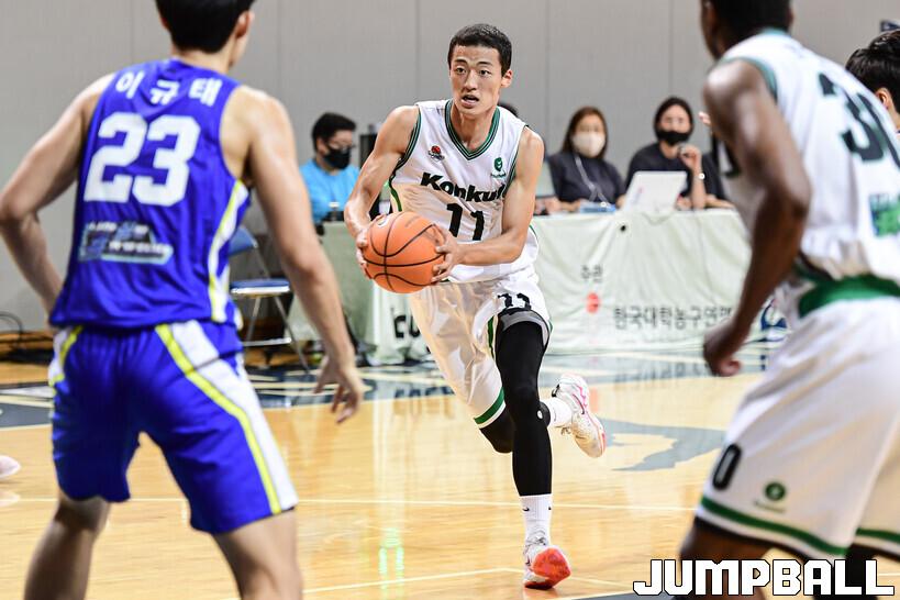 1일 연세대학교 신촌캠퍼스에서 열린 2022 KUSF 대학농구 U-리그 연세대와 건국대의 플레이오프 경기, 건국대 박상우가 골밑으로 들어가고 있다.