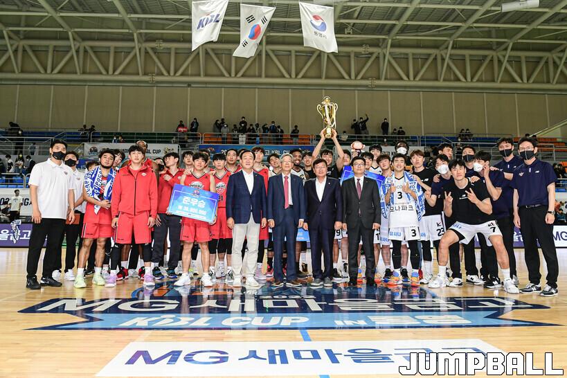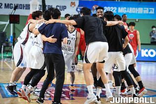 8일 통영체육관에서 열린 2022 MG새마을금고 울산현대모비스와 수원 KT의 결승전 경기, KT가 현대모비스에 74-72로 승리하며 컵대회 우승을 차지하였다. 우승팀 수원 KT와 준우승팀 울산 현대모비스가 단체 사진 촬영을 하고 있다.
