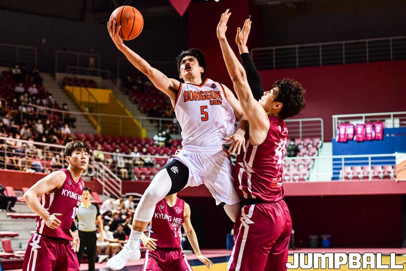 2일 경희대 국제캠퍼스 선승관에서 열린 2022 KUSF 대학농구 U-리그 경희대와 동국대의 플레이오프 8강전 경기, 동국대 박승재가 레이업슛을 시도하고 있다.