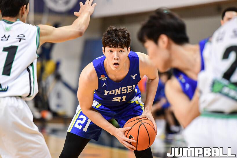 1일 연세대학교 신촌캠퍼스에서 열린 2022 KUSF 대학농구 U-리그 연세대와 건국대의 플레이오프 경기, 연세대 박준형이 패스를 받아줄 동료를 찾고 있다.
