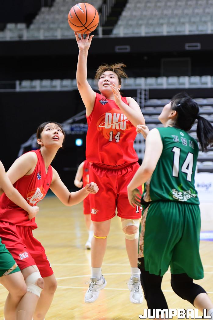 [점프볼=수원/박상혁 기자] 8일 서수원칠보체육관에서 열린 2021 KUSF 대학농구 U리그 단국대와 광주대의 여자부 4강 경기, 단국대 박성은이 골밑에서 슛을 시도하고 있다.