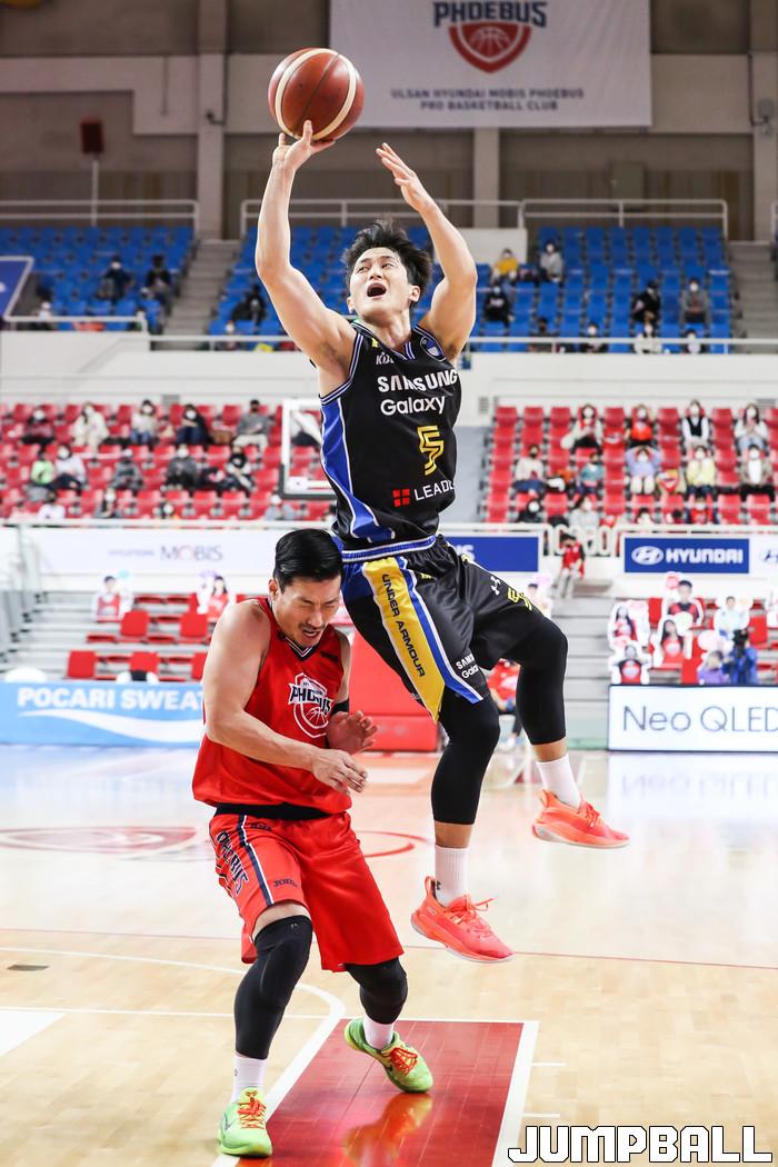 [점프볼=윤민호 기자]  4 울산 동천체육관에서 열린 2020-2021 현대모비스 프로농구 울산 현대모비스와 서울 삼성의 경기에서 삼성 김광철이 현대모비스 이현민 수비를 피해 슛을 하고 있다.