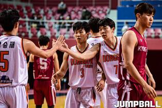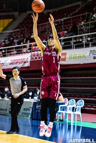 2일 경희대 국제캠퍼스 선승관에서 열린 2022 KUSF 대학농구 U-리그 경희대와 동국대의 플레이오프 8강전 경기, 동국대 김승협이 자유투를 시도한후 관중석을 향해 쉿 세리머니를 하고 있다.