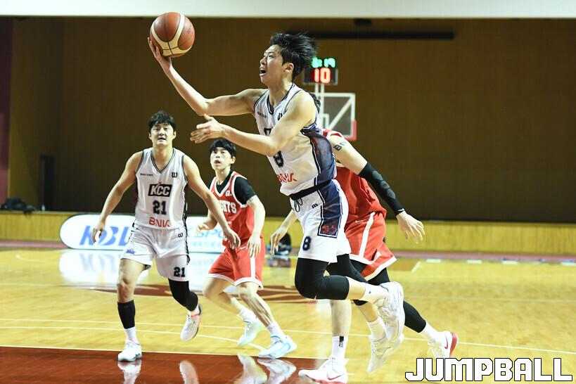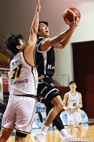 [점프볼=용인/유용우 기자] 24일 경희대 선승관 체육관에서 열린 2025-2026 KBL D리그 서울 SK와 부산 KCC의 경기, KCC 윤기찬이 몸을 던지며 공격을 시도하고 있다.