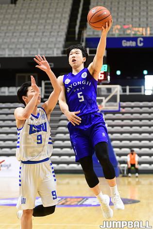 [점프볼=수원/박상혁 기자] 27일 서수원칠보체육관에서 열린 2021 KUSF 대학농구 U리그 연세대와 건국대의 경기, 건국대 정민수가 레이업슛을 시도하고 있다.