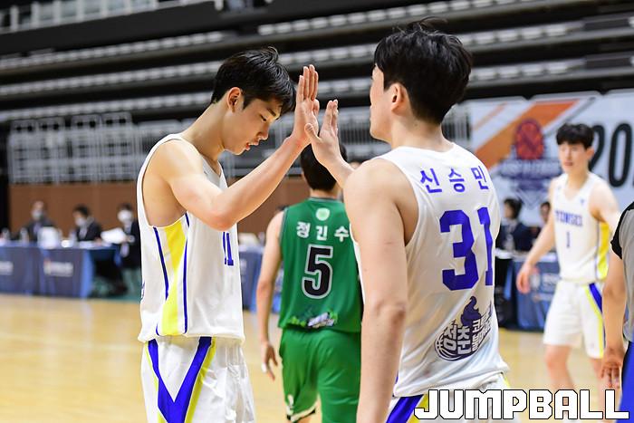 [점프볼=수원/박상혁 기자] 27일 서수원칠보체육관에서 열린 2021 KUSF 대학농구 U리그 연세대와 건국대의 경기, 연세대 이원석과 신승민이 하이파이브를 하고 있다.