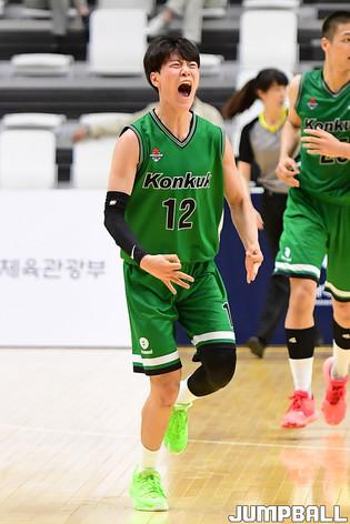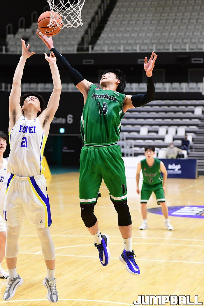 [점프볼=수원/박상혁 기자] 27일 서수원칠보체육관에서 열린 2021 KUSF 대학농구 U리그 연세대와 건국대의 경기, 건국대 주현우가 리바운드를 잡아내고 있다.