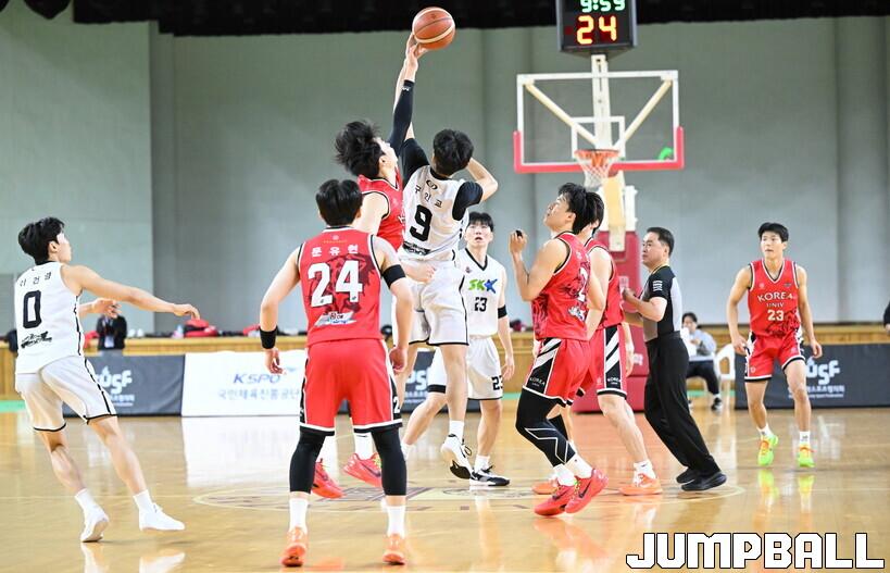 [점프볼=안암/문복주 기자] 12일 고려대학교 화정체육관에서 2025 KUSF 대학농구 U-리그 남자 대학부 챔피언결정전으로 고려대와 성균관대의 경기, 성균관대 구인교가 경기시작 점프볼을 다투고 있다.