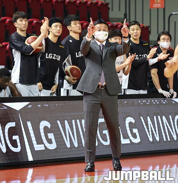 [점프볼=인천/한명석 기자] 17일 인천삼산체육관에서 열린 2020-2021 현대모비스 프로농구 인천전자랜드와 창원LG와의 경기, 창원 LG 조성원 감독이 선수들에게 수비를 지시하고 있다.