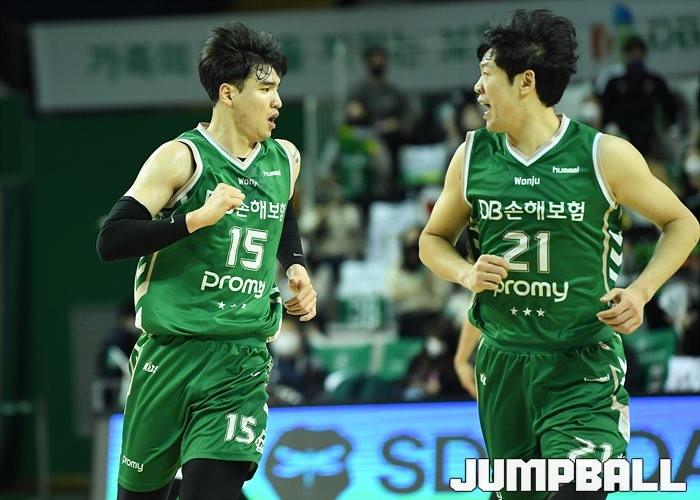 06일 원주종합체육관에서 열린 2021-2022 KGC인삼공사 정관장 프로농구 원주 DB와 울산 현대모비스의 경기, DB 김종규와 김철욱이 백코트를 하고 있다.