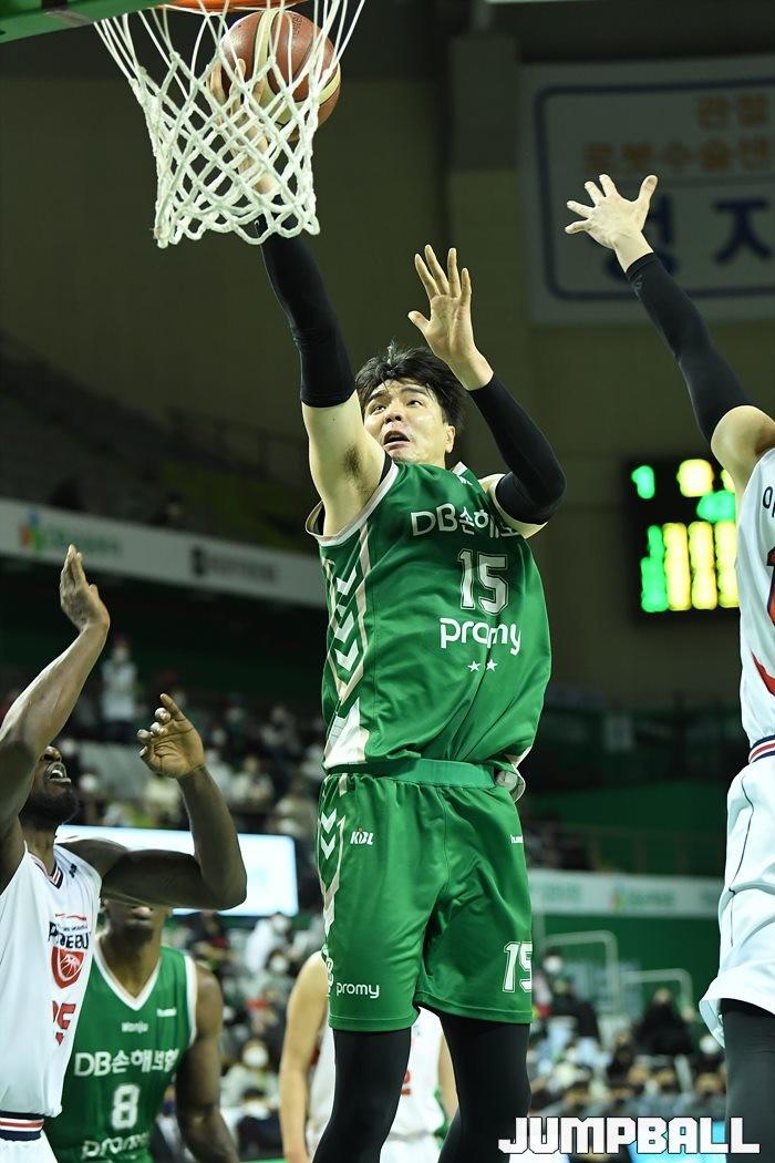 06일 원주종합체육관에서 열린 2021-2022 KGC인삼공사 정관장 프로농구 원주 DB와 울산 현대모비스의 경기, DB 김종규가 레이업을 올리고 있다.