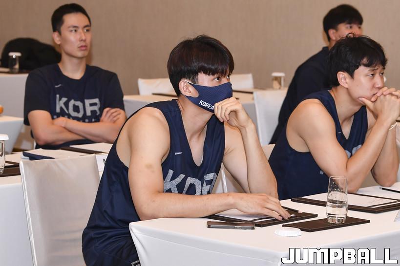 남자 농구 대표팀은 11일 인도네시아 자카르타 페이몬트 호텔 3층 회의실에서 12일 중국전을 대비해 비디오 미팅을 가졌다. 대표팀 이대성이 중국 선수들 분석영상을 바라보고 있다.