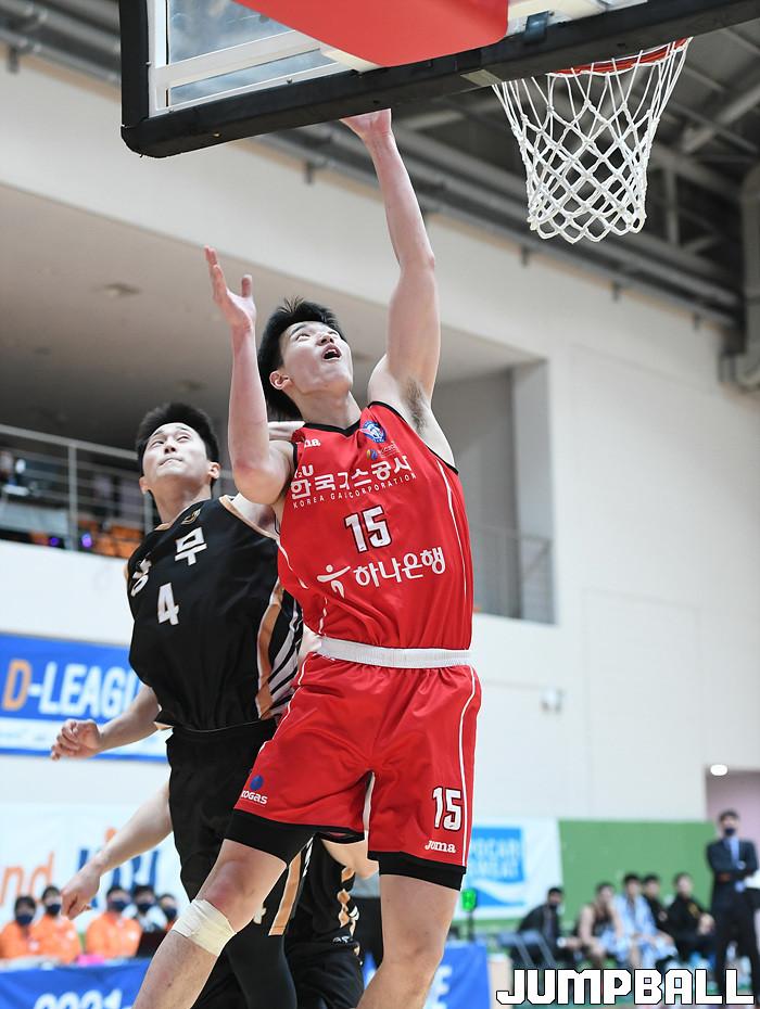 18일 이천 LG 챔피언스파크에서 열린 2021-2022 KBL D-리그 대구 한국가스공사와 상무의 경기, 한국가스공사 최주영이 굿어시스트를 받아서 득점하고 있다.