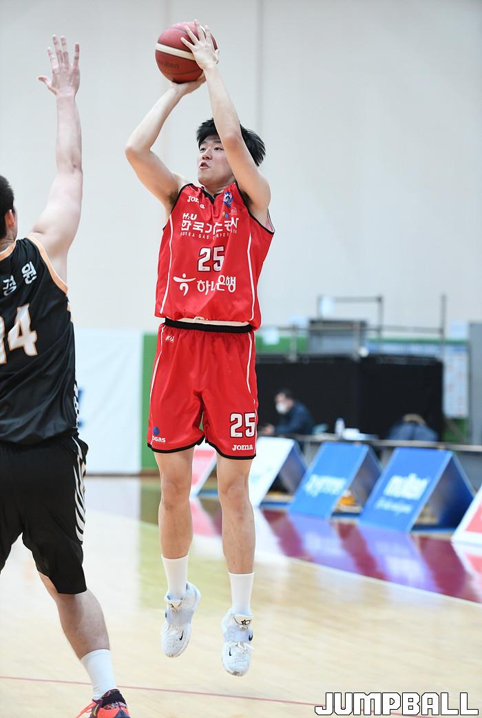 18일 이천 LG 챔피언스파크에서 열린 2021-2022 KBL D-리그 대구 한국가스공사와 상무의 경기, 한국가스공사 김진모가 외곽에서 추격의 3점슛을 시도하고 있다.