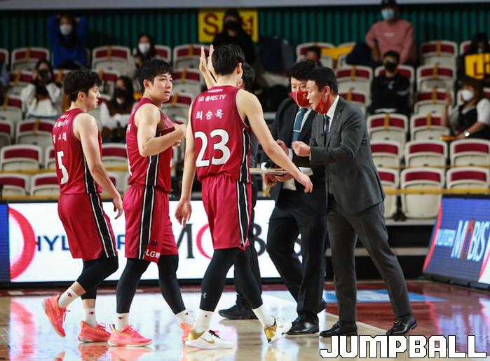 [점프볼=정을호 기자] 24 창원실내체육관에서 열린 2020-2021 현대모비스 프로농구 창원LG 서울삼성의 경기, LG 조성원 감독이 경기 중 선수들에게 작전을 지시하고 있다.