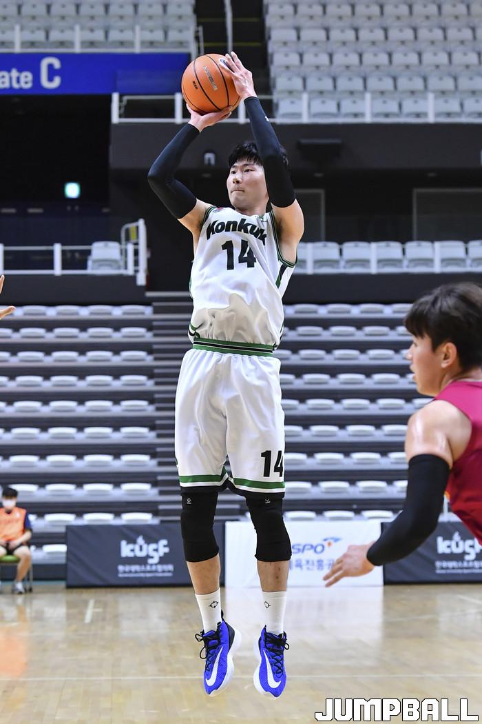 [점프볼=수원/홍기웅 기자] 5일 수원 서수원칠보체육관에서 열린 '2021 KUSF 대학농구 U-리그 3차대회' 경희대와 건국대의 경기. 건국대 주현우가 3점슛을 던지고 있다.