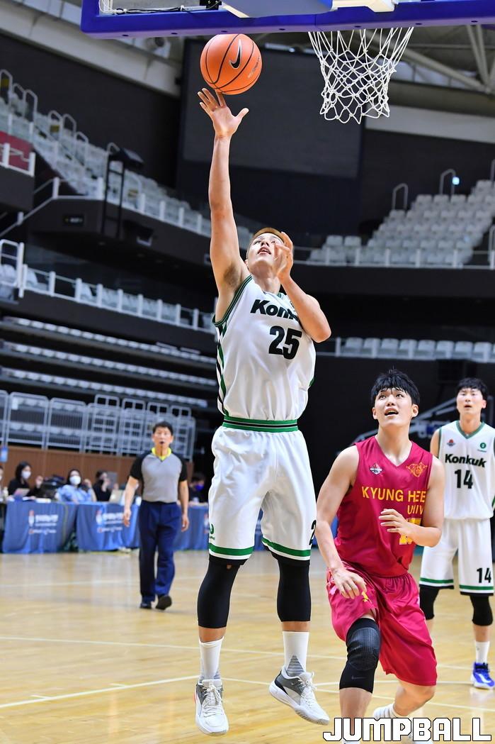 [점프볼=수원/홍기웅 기자] 5일 수원 서수원칠보체육관에서 열린 '2021 KUSF 대학농구 U-리그 3차대회' 경희대와 건국대의 경기. 건국대 최승빈이 골밑슛을 올리고 있다.