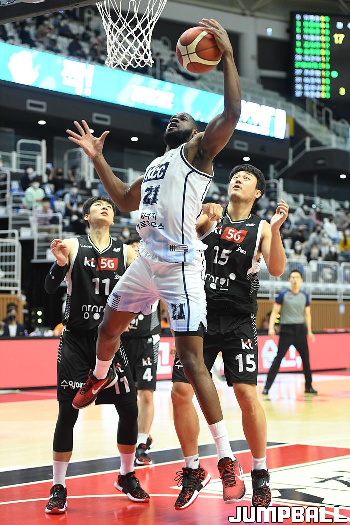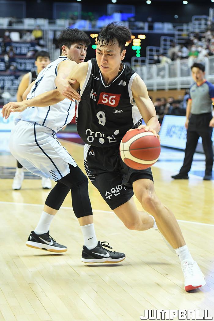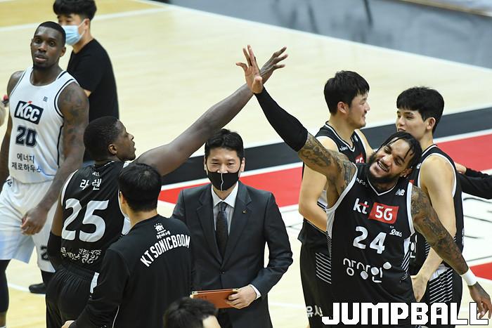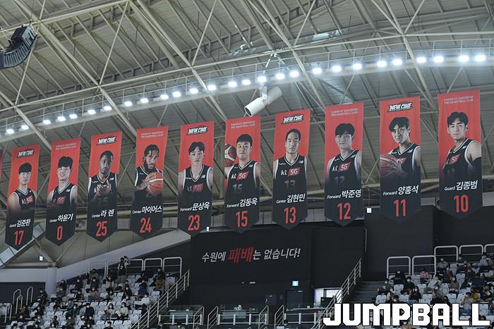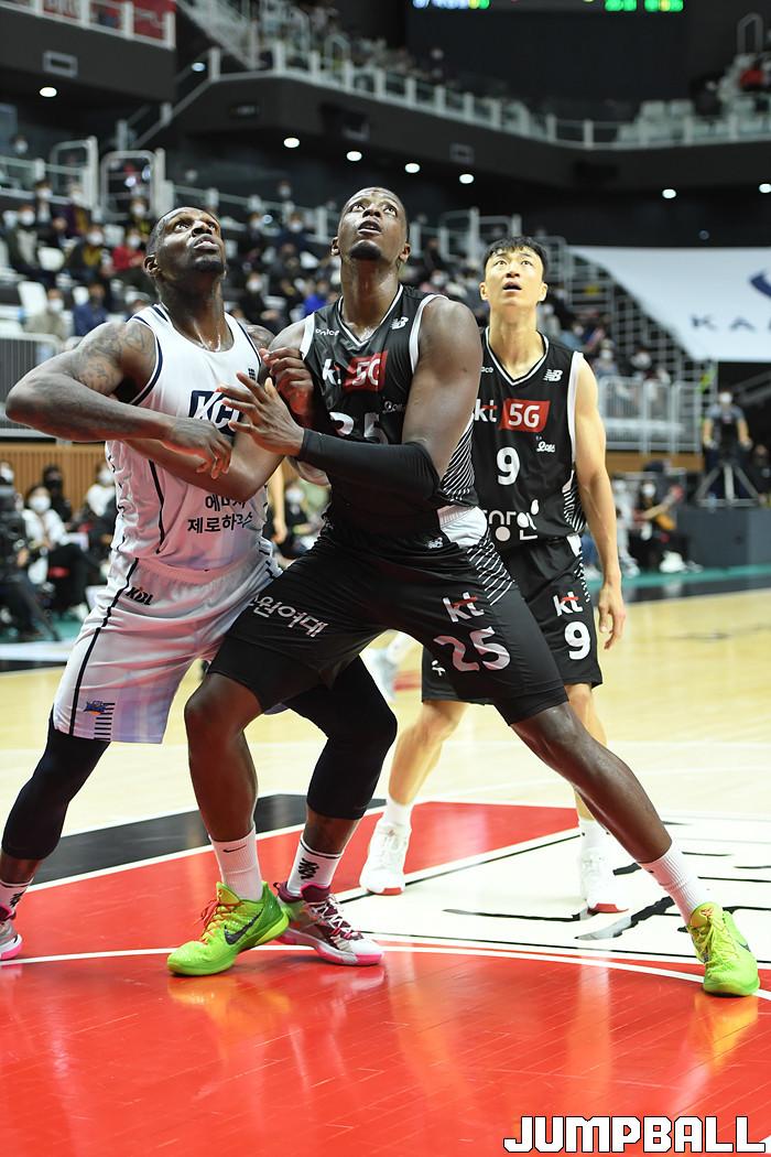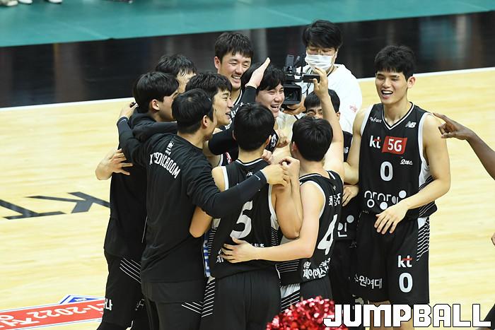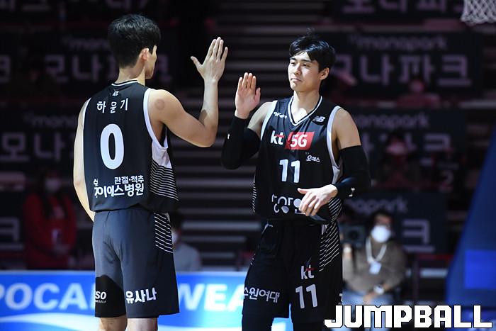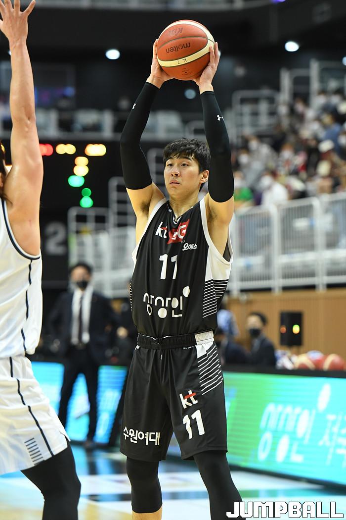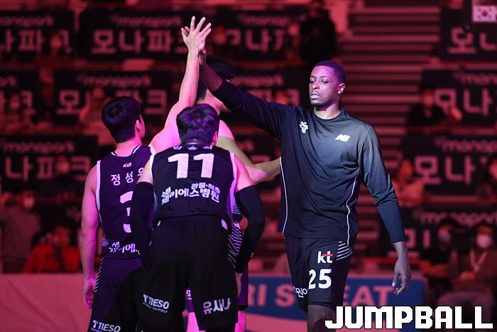7일 경기도 수원에 위치한 KT 소닉붐 아레나에서 열린 2021-2022 KGC인삼공사 정관장 프로농구 수원 KT와 전주 KCC의 경기, KT가 홈에서 KCC에 80-79로 승리했다. KT와 KCC 경기 화보